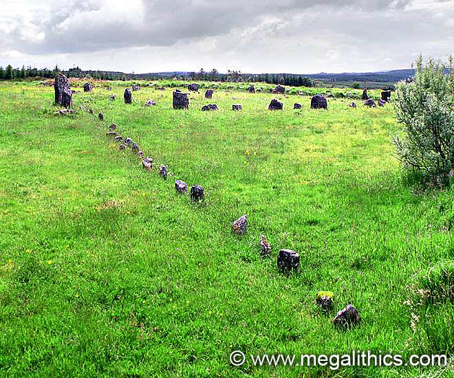 Circle E and rows from the NE. The short high row and long low row are a recurring feature of the Beaghmore complex.