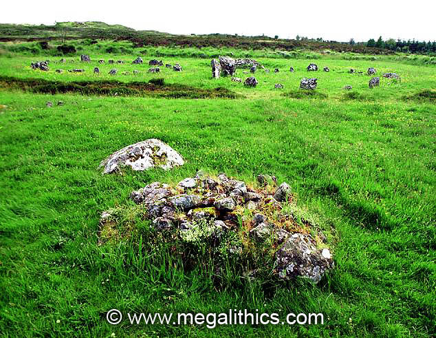 This small cairn (probably cairn 9), sits at the end of the field wall remains by the stone row. Circles F & G respectively stand in the background.
