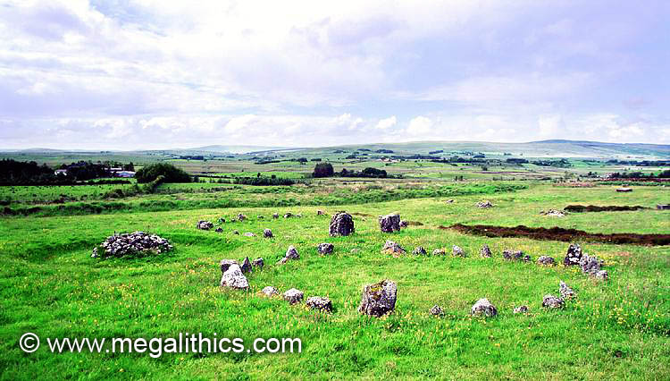 Circle F from the SE with cairn 10 and circle G behind. The entrance stones of circle G are prominent in this shot.