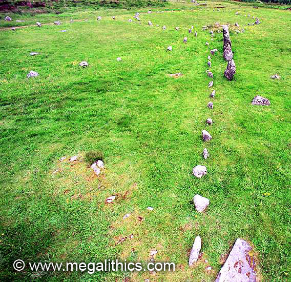 Looking SW along the rows to the cairn and circles C (left), and D (right background). There are actually three rows here, but the low row the ran on the right side of the high row has not survived too well.