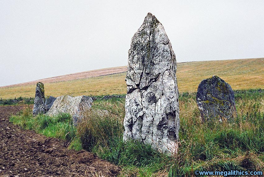 The massive 3.2m tall quartz pillar used as an outlier at Balquhain.