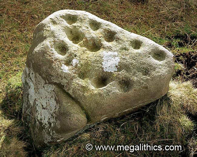 Low angle illumination of the eastern stone. There are supposed to be 16 cupmarks on the upper surface of this stone. We could see twelve for definite, and perhaps two more with a bit of imagination.