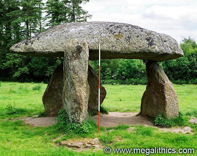 Spinsters Rock viewed from the NNE. Note the flat underside and domed top of the capstone. (Ranging pole 2m long).